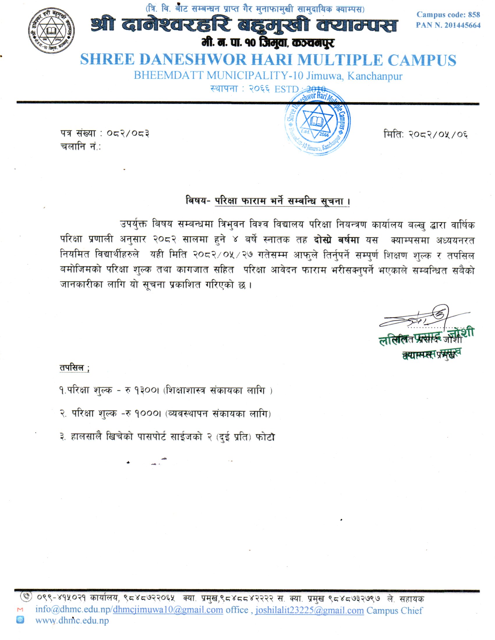 उपर्युक्त बिषय सम्बन्धमा त्रिभुवन विश्व विद्यालय परिक्षा नियन्त्रण कार्यालय बल्खु द्धारा र्वािर्षक परिक्षा प्रणाली अनुसार २०८२ सालमा हुने ४ बर्षे स्नातक तह दोस्रो बर्षमा यस क्याम्पसमा अध्ययनरत नियमित विद्यार्थीहरुले यही मिति २०८२।०५।२७ गतेसम्म आफुले तिर्नुपर्ने सम्पुर्ण शिक्षण शुल्क र परिक्षा शुल्क तथा कागजात सहित परिक्षा आवेदन फाराम भरीसक्नुपर्ने भएकाले सम्बन्धित सबैको जानकारीका लागि यो सूचना प्रकाशित गरिएको छ ।