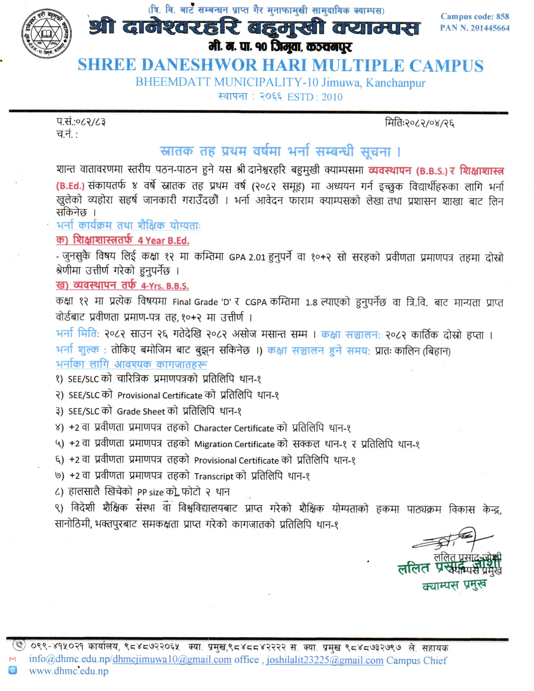 शान्त वातावरणमा स्तरीय पठन-पाठन हुने यस श्री दानेश्वरहरि बहुमुखी क्याम्पसमा व्यवस्थापन (B.B.S.) र शिक्षाशास्त्र (B.Ed.) संकायतर्फ ४ वर्षे स्नातक तह प्रथम वर्ष (२०८२ समूह) मा अध्ययन गर्न इच्छुक विद्यार्थीहरुका लागि भर्ना खुलेको व्यहोरा सहर्ष जानकारी गराउँदछौं । भर्ना आवेदन फाराम क्याम्पसको लेखा तथा प्रशासन शाखा बाट लिन सकिनेछ ।
